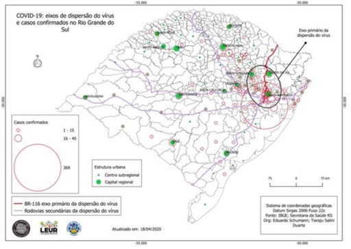 Na porção Sul, avaliam os pesquisadores, devido à existência de municípios com extensões territoriais maiores, a transmissão comunitária fica significativamente circunscrita (mas não exclusiva) a uma dispersão intra-municipal. Diferentemente, a porção central e principalmente norte do Rio Grande do Sul além da transmissão intra-municipal, visualiza-se uma significativa estrutura de propagação para municípios próximos tendo em vista a proximidade e integração econômica entre essas localidades. No caso dos municípios de maior extensão territorial, processo verificado principalmente no sul do estado, as concentrações populacionais maiores correspondem às cidades, propriamente ditas, sendo verificável que esses municípios possuem grande área rural com baixo índice de povoamento. O contrário se observa no norte do estado, onde a proximidade entre as cidades é maior, em face à estrutura da divisão territorial que, nesse caso, apresenta mais núcleos de aglomerações urbanas.