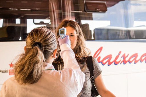 Voluntários verificam a temperatura dos passageiros que desembarcam dos ônibus intermunicipais. Casos suspeitos são notificados à Secretaria de Saúde